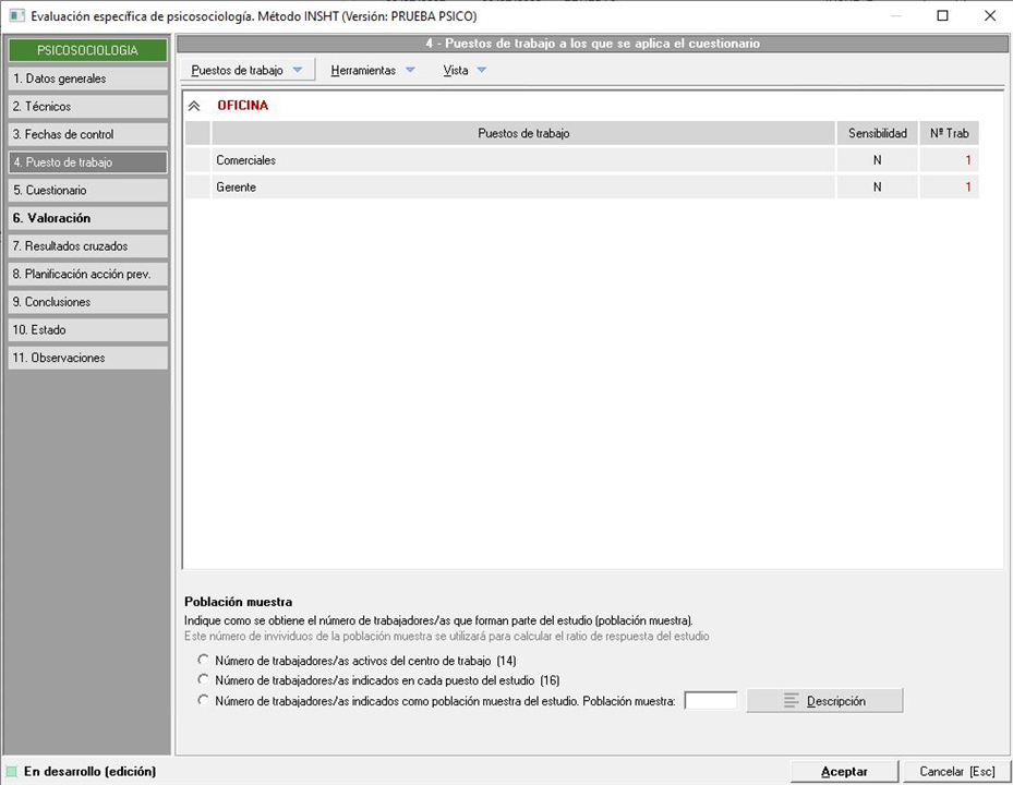 En el apartado '4. Puesto de trabajo', el usuario deberá indicar los puestos de trabajo sobre los que se realiza el estudio.