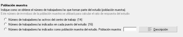 - Número de trabajadores indicados como población muestra del estudio. Aquí se podrá indicar manualmente el número de trabajadores sobre los que se va a realizar el estudio, que no tienen por qué coincidir con el número total de trabajadores del centro (por ejemplo, el estudio puede aplicarse únicamente a una parte de los trabajadores, pero no a la totalidad de trabajadores del centro). Además, si se selecciona la pestaña