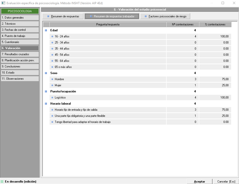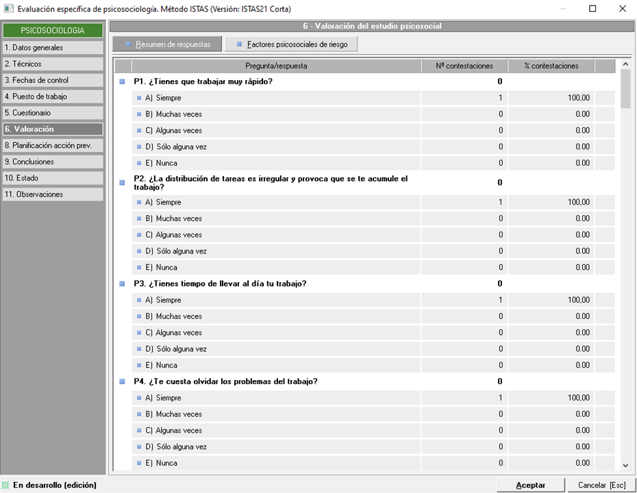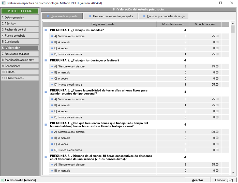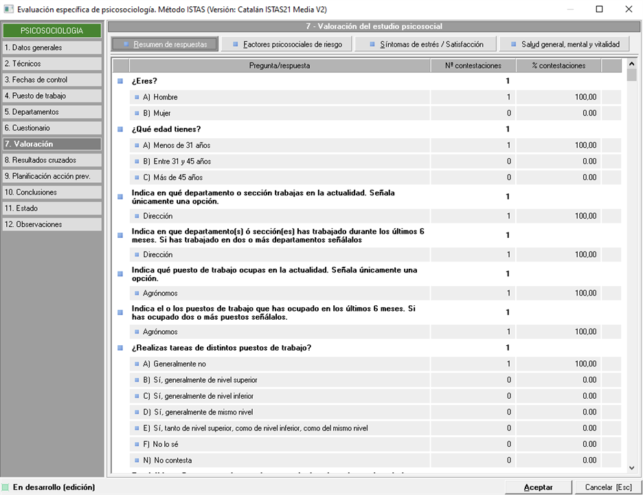 Para este caso, en este apartado se muestra un resumen de respuestas general, otro de respuestas según los factores psicosociales de riesgo del método, otra pestaña destinada a las respuestas referentes a los síntomas de estrés / satisfacción y, por último, respuestas según la salud general, mental y vitalidad: