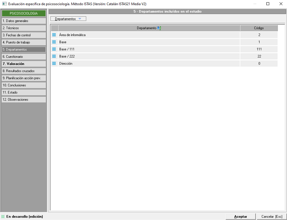 En el caso del método ISTAS Medio, encontrará un cuestionario en el que se incluyen preguntas sobre puesto de trabajo y sobre departamento, entre otros.