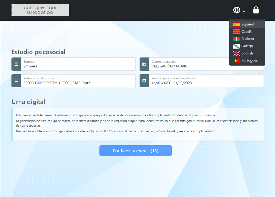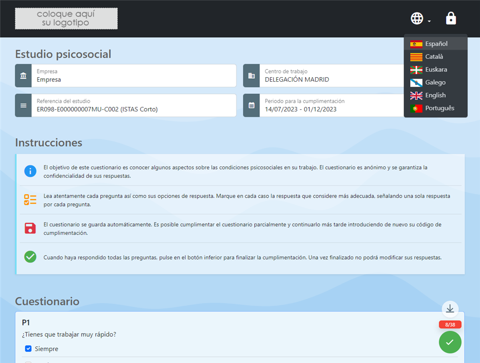 . Ahora bien, si necesita hacerlo en otro idioma, deberá de haberse configurado anteriormente como se explica en el manual de traducir cuestionarios psicosociales.