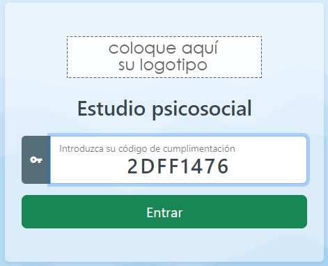 Con el código de cumplimentación guardado, el trabajador accederá a la dirección de la web añadiendo "direcciondesuweb/psicosocial" (si se manda el código por email el trabajador recibirá también el enlace al web para su cumplimentación), para acceder a la cumplimentación mediante el código que se apuntó o se envió a su correo electrónico: