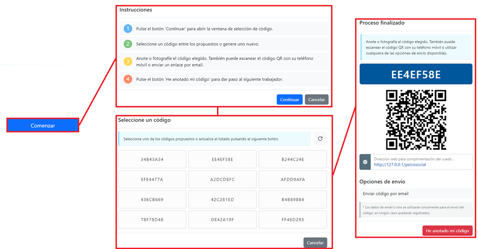 hasta que seleccione el deseado. Finalmente la locución avisará de que se ha seleccionado un código, a lo que el responsable deberá atender ya que la pantalla está mostrando un código de acceso que solo puede copiar un único trabajador. Éste lo copiará en un papel, se lo enviará a su correo electrónico o escaneará el código QR para acceder directamente a cumplimentarlo. NOTA: Es importante que el trabajador se asegure que tiene el código guardado, ya que lo necesitará para acceder al cuestionario, pudiendo acceder en diferentes ocasiones hasta que finalice su cumplimentación, como se verá a continuación. En la propia pantalla le muestra la dirección web a la que tiene que acceder el trabajador para su cumplimentación.