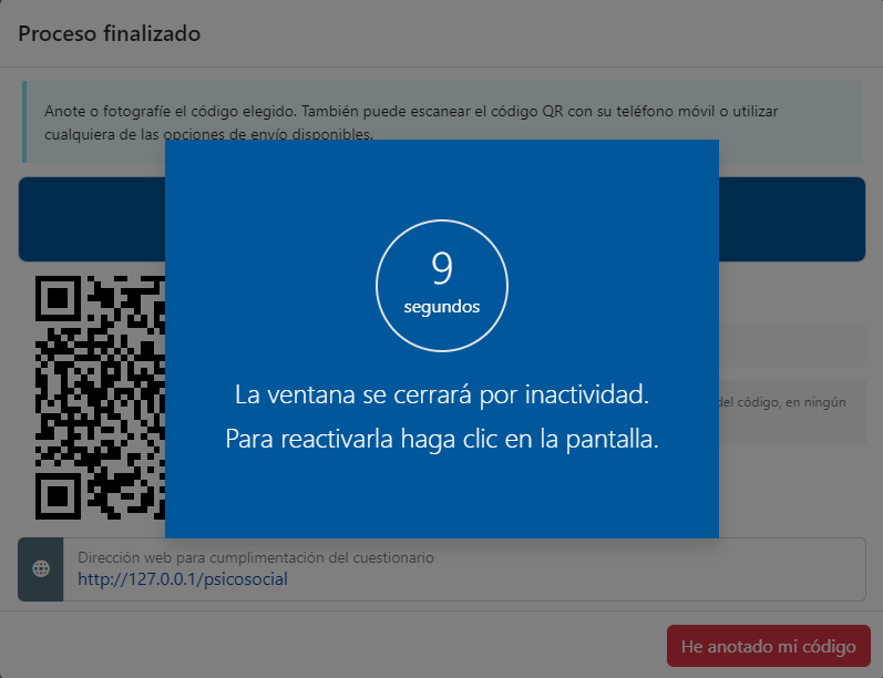 Durante todo este proceso se puede temporizar el tiempo de inactividad mediante la configuración, de manera que se cierre el proceso una vez superado el tiempo máximo establecido: