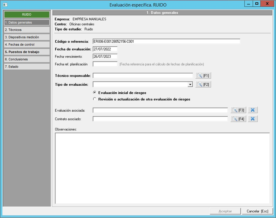 Una vez seleccionado el tipo de evaluación, aparecerá el formulario del estudio de ruido. Para grabar el estudio, será necesario cumplimentar los datos obligatorios que aparecen en el apartado '1. Datos generales', estos datos son los que aparecen en negrita (código, fecha de evaluación, técnico responsable y tipo de evaluación).