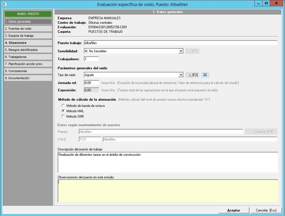 En este apartado aparecerán los datos generales del puesto de trabajo en el cual el usuario tendrá que cumplimentar, al menos, los que aparecen en negrita, exceptuando el campo 'Exposición' que se calculará automáticamente con la información que se indique en el apartado '4. Situaciones'. El nombre del puesto, la sensibilidad y el número de trabajadores, vendrán preestablecidos, ya que se habrán indicado en el momento en el que el puesto de trabajo se añade al estudio. Estos datos sólo serán editables si el puesto de trabajo se ha añadido desde el mantenimiento de puestos.