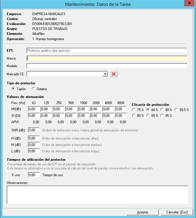 En Prevengos existe la posibilidad de que se realicen estudios específicos de ruido siguiendo la estrategia de medición basada en la tarea, de acuerdo con la Norma UNE-EN ISO 9612. Para ello, el usuario añadirá las mediciones que realiza sobre la tarea o tareas que se realizan en el puesto de trabajo y, en base a esas mediciones, el programa calculará el nivel de exposición diario equivalente y el valor de atenuación de los EPIs, en su caso.