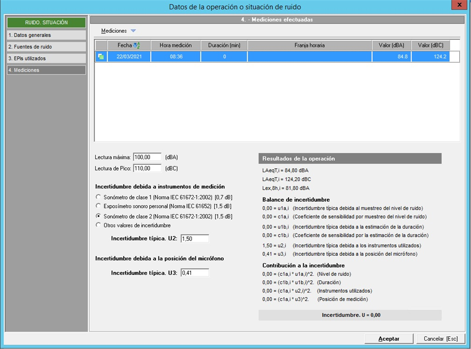 A continuación, en el apartado 'Incertidumbre debida a instrumentos de medición', se deberá indicar el tipo de dispositivo de medición que se hubiera empleado y Prevengos determinará de forma automática la 'Incertidumbre típica U2', de acuerdo con lo establecido en la Norma UNE-EN ISO 9612.