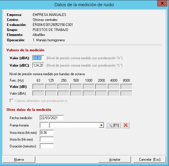 Este apartado es el más importante del estudio ya que en él se van a reflejar las tareas o situaciones de exposición a ruido, con las mediciones de ruido correspondientes para cada tarea. Al acceder a este punto, verán que la pantalla tiene varios apartados, en la parte superior se indicarán las tareas o situaciones donde existe una exposición al ruido, en la parte central se indicarán las mediciones correspondientes a cada una de ellas y en la parte inferior, la valoración resultante.
