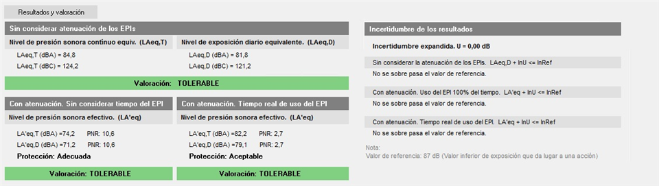 - Sin considerar atenuación de los EPIs. Aparece en la parte superior izquierda, es el cálculo de la exposición al ruido evaluado, sin tener en cuenta el uso del EPI.