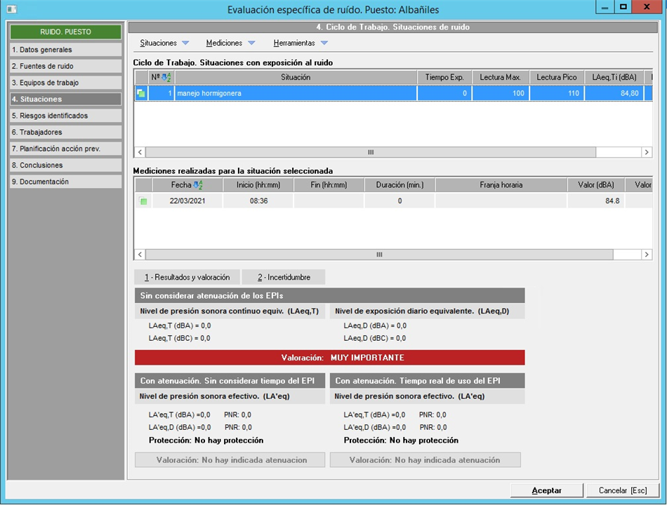 Una vez cumplimentados los datos de las mediciones y grabada la situación de ruido que se está evaluando, al volver a la pantalla del puesto de trabajo, en la parte inferior del apartado '4. Situaciones', aparecerá la valoración. Esta valoración será la valoración global de todas las tareas, operaciones o situaciones de exposición de ruido evaluadas.