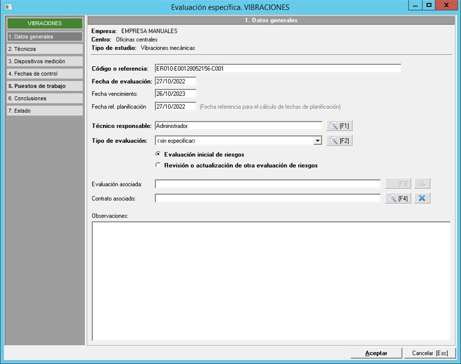 Una vez seleccionado el tipo de evaluación, aparecerá el formulario del estudio de vibraciones bgfv. Para grabar el estudio, será necesario cumplimentar los datos obligatorios que aparecen en el apartado '1. Datos generales', estos datos son los que aparecen en negrita (código, fecha de evaluación, técnico responsable y tipo de evaluación).