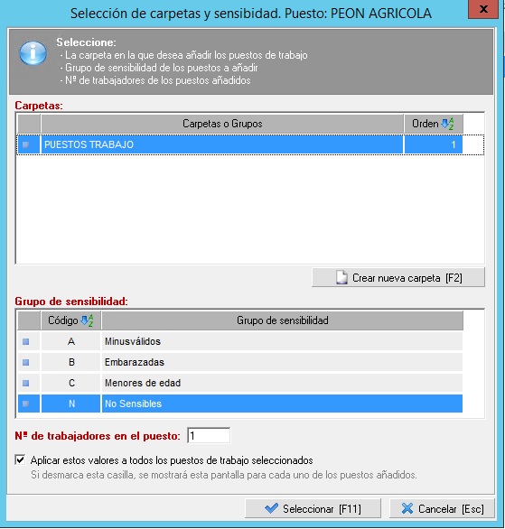 - Añadir puestos de trabajo desde el mantenimiento. Esta opción le da acceso al mantenimiento general de puestos de trabajo para que añada al estudio los puestos que desee evaluar. Estará siempre habilitada. Al añadir los puestos de trabajo desde esta opción, se le solicitará que elija la carpeta en la que quiere ubicarlos dentro del estudio. Si no existe ninguna carpeta, deberá crear una nueva pulsando el botón 'Crear nueva carpeta'. También tendrá que indicar el grupo de sensibilidad y el número de trabajadores que hay en ese puesto de trabajo.