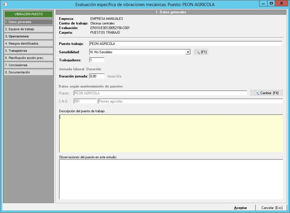 Una vez añadidos los puestos de trabajo, tendrán que hacer doble clic sobre cada uno de ellos para acceder a su ficha de datos y realizar el estudio individual de cada uno de ellos.