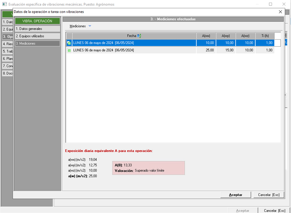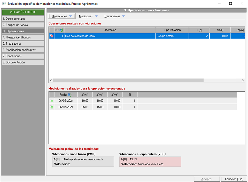Este apartado es el más importante del estudio, ya que en él se van a reflejar las situaciones de exposición a vibraciones del puesto de trabajo, con las mediciones que se realizan en cada situación. Al acceder a este punto, verán que la pantalla tiene varios apartados, en la parte superior, están las operaciones evaluadas, en la parte central las mediciones de la situación seleccionada, y en la parte inferior la valoración.