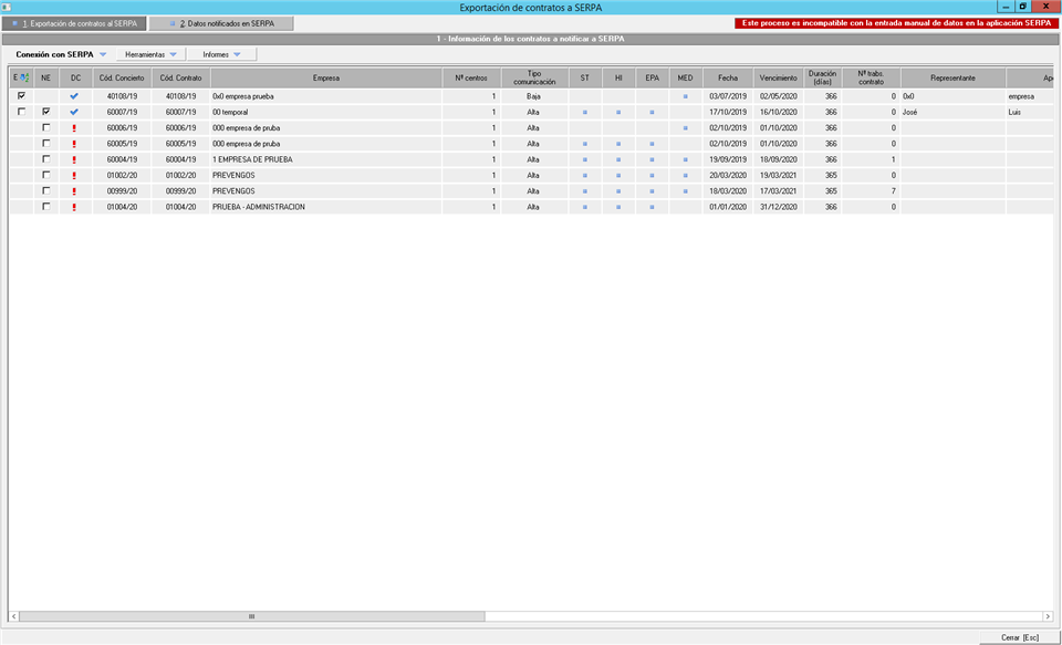 Desde el módulo "ADM", con la herramienta "Comunicación contratos SERPA" identifica los contratos vigentes (a fecha de exportación) y generará un fichero Excel, con los datos de contratos y empresas, para la notificación a SERPA.