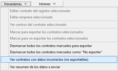 Desde la pantalla de exportación, tendrá la opción de corregir los errores en los datos de la empresa, el centro o el contrato, sin salir de esta pantalla. Esta opción la encontrarán en 'Herramientas > Ver contratos con datos incorrectos (no exportables)', con la que accederán a un listado donde se muestran los datos que se han de corregir (resaltados en rojo) para que el contrato se pueda exportar.