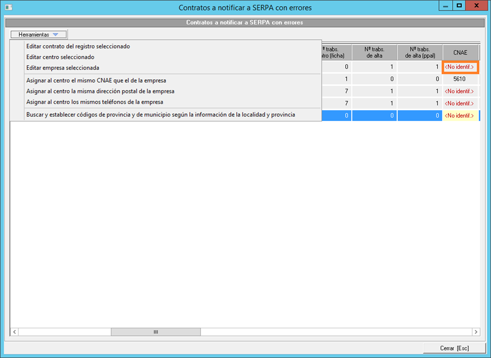 El menú "Herramientas" ofrece las opciones de edición para el contrato, centro y empresa, y herramientas de asignación de CNAE, dirección postal, teléfonos y códigos SERPA (provincia y municipio).