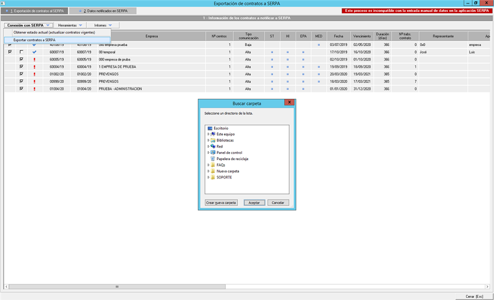 Marcada la casilla de la columna "E" en cada registro, desde el menú 'Conexión con SERPA > Exportar contratos a SERPA' iniciamos el proceso de generación del fichero Excel, dónde sólo ha de indicar en que ruta del equipo se guardará el fichero.