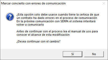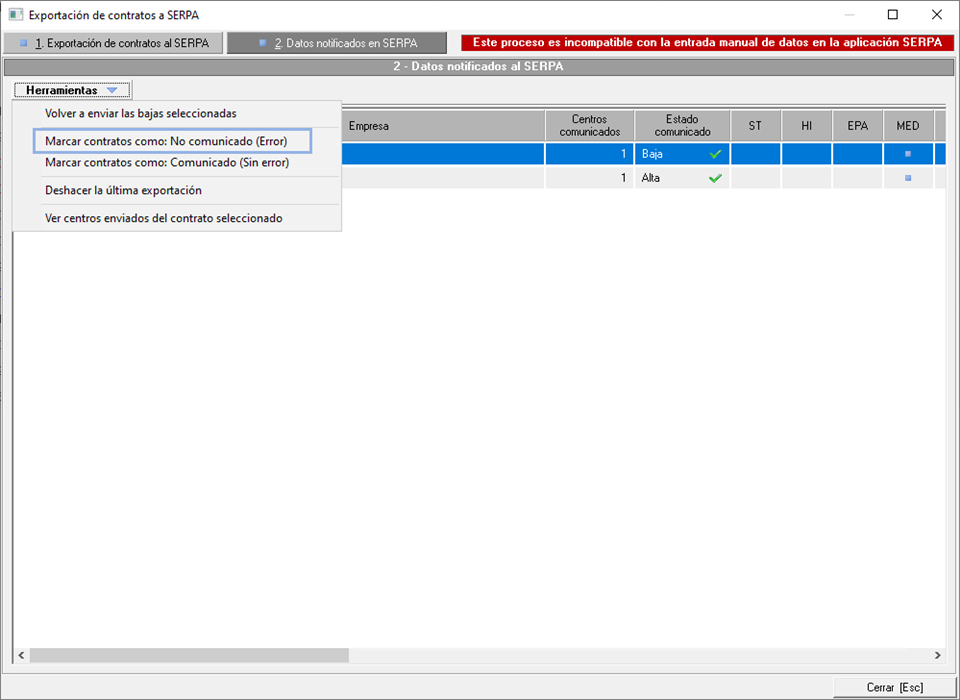 Tras la revisión del informe, se procederá a marcar el contrato, Prevengos, como error usando el menú Herramientas > Marcar contratos como: No comunicado (Error), en la pestaña 2. Datos notificados en SERPA.