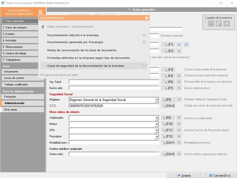 La documentación adjuntada y generada sobre una empresa puede ser exportada de Prevengos mediante la opción "Copia de seguridad de la documentación de la empresa" presente en los módulos de Gestión General, Técnico, CAE y Medicina. Para utilizarla, se tendrá que dirigir a la ficha de datos de la empresa en cualquiera de los módulos mencionados, tal y como muestra la siguiente imagen: