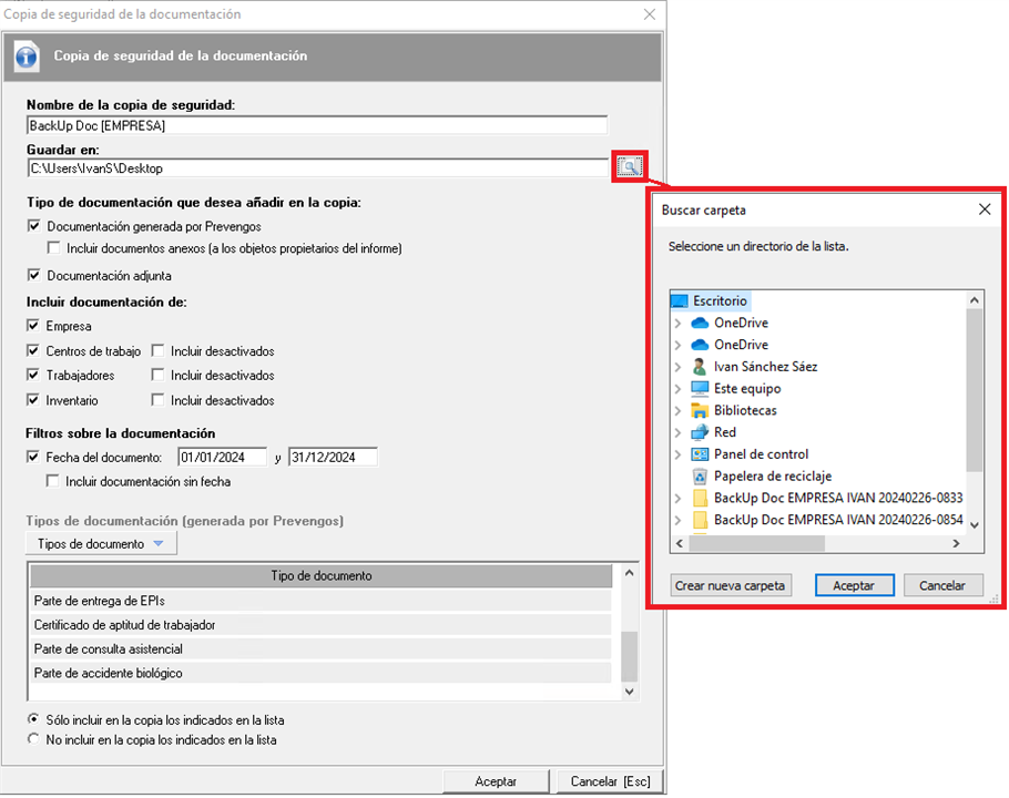 Una vez seleccionada la opción de copia de seguridad, podrá modificar el Nombre de la carpeta donde se incluirán los documentos donde el marcador "[EMPRESA]" insertará el nombre de la empresa, así como la ruta donde se guardarán ("Guardar en") con el botón de la lupa.