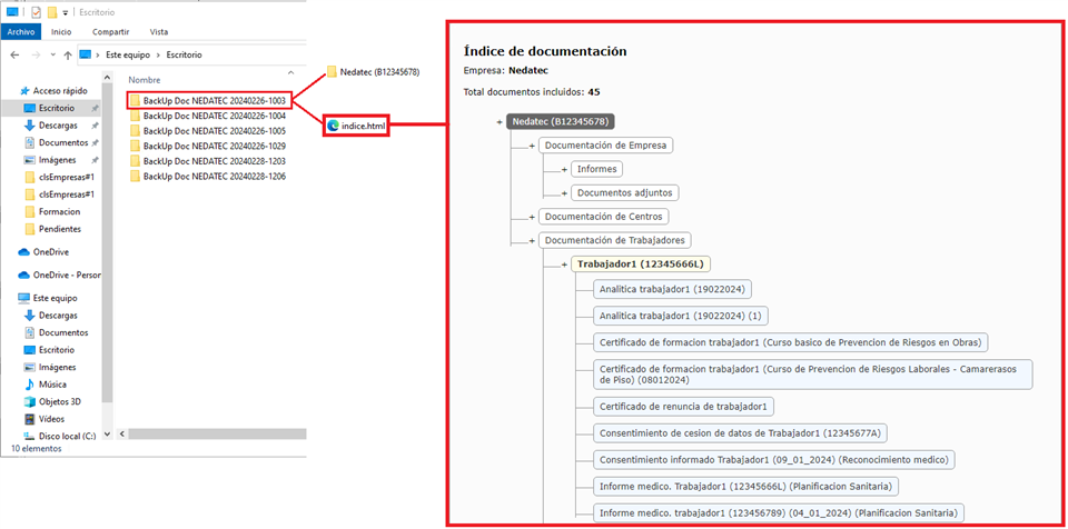 Ya finalizada la copia de seguridad, se observará que la carpeta de la documentación exportada se compone de una subcarpeta con el nombre de la empresa donde se encuentra toda la documentación y de un índice en un formato html. Este último es de utilidad para encontrar un informe en concreto, ya que permite navegar entre los centros o trabajadores de la empresa.