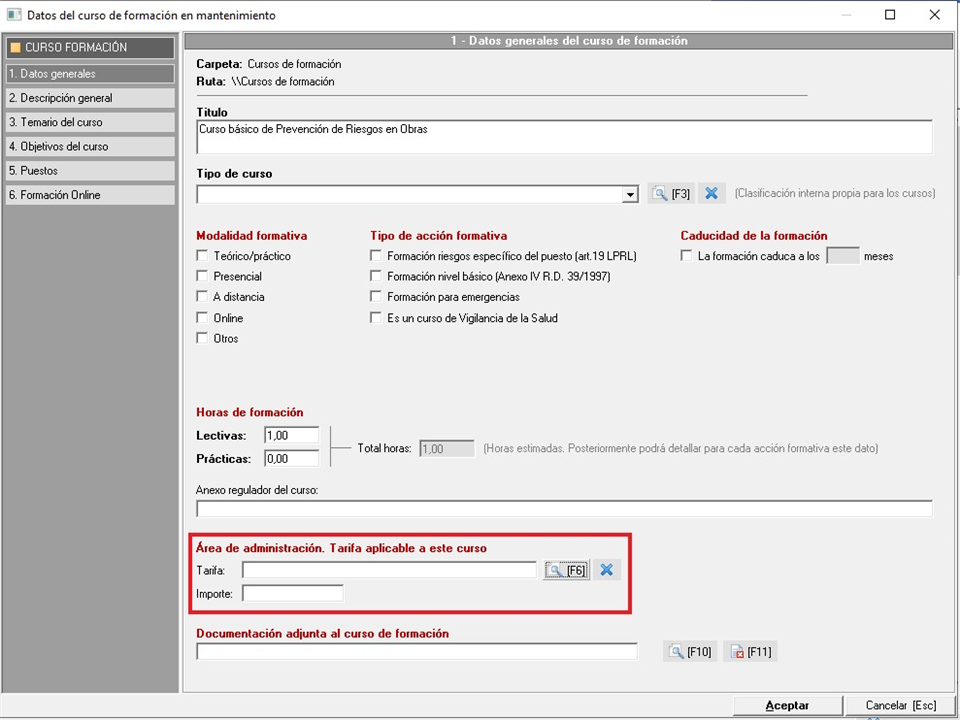 La configuración de las tarifas de formación se realiza en el mantenimiento de tarifas, al cuál sólo puede acceder desde otro mantenimiento que es el de cursos de formación, por lo que para llegar al mantenimiento de tarifas, debe acceder primero al mantenimiento de 'Cursos de formación' desde el menú desplegable 'Mantenimientos' que encontrará en el módulo de gestión general. Una vez dentro del mantenimiento de formación, tendrá que editar un curso de formación, y en los datos generales del curso, encontrará el apartado de la 'Tarifa aplicable' al curso, donde encontrará el botón