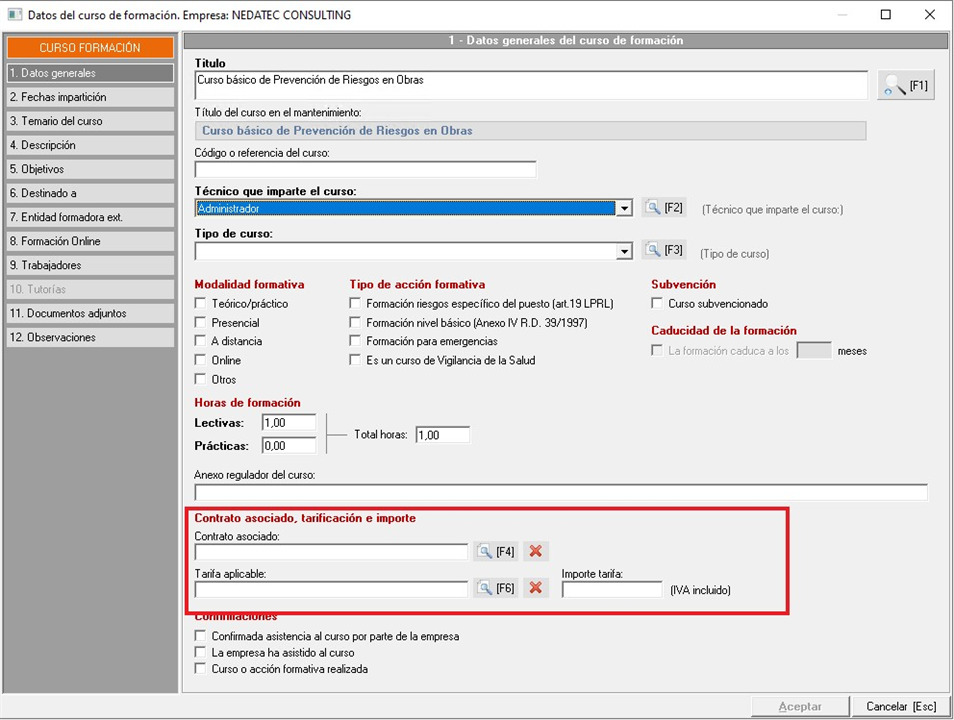 Una vez creado el curso de formación en la ficha del cliente, en el apartado '1. Datos generales', encontrarán el bloque "Contrato asociado, tarificación e importe", desde el que podrán asignar una tarifa pulsando el botón