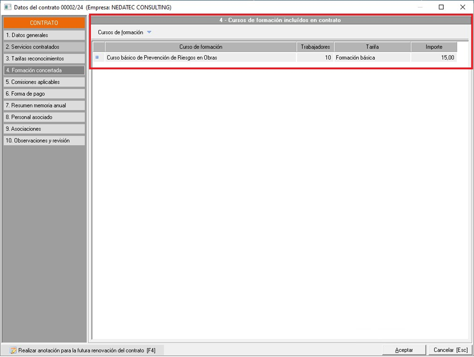 Para poder hacer esta asignación, deben tener en cuenta que el curso que están creando en la empresa, debe estar incluido en el contrato concretamente en el apartado '4. Formación concertada' (siguiente imagen), ya que de lo contrario, no se podrá realizar esta asignación de tarifa según contrato.