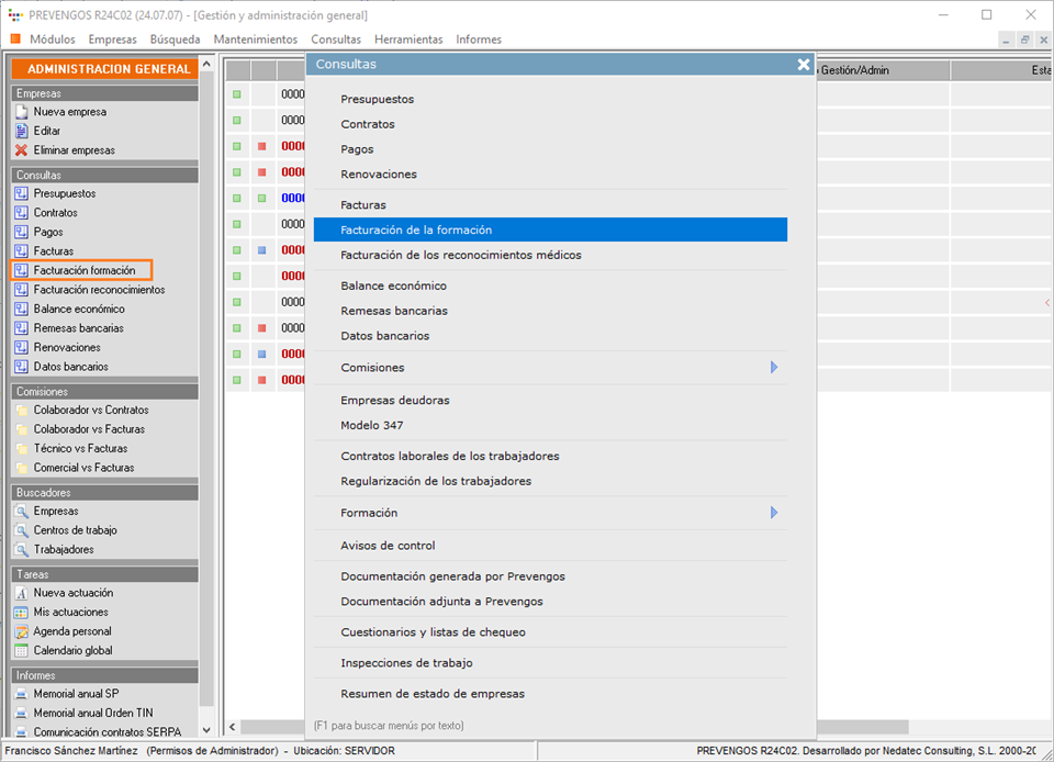 En Prevengos existe la posibilidad de facturar cursos de formación registrados en las empresas. Para poder realizar esta facturación, vamos a utilizar una consulta, que nos permitirá localizar los cursos de formación que se han realizado y que están pendientes de facturar. Para acceder a esta pantalla de facturación de formación, vamos a desplegar el menú 'Consultas' del módulo de administración, y vamos a pulsar sobre la opción 'Facturación de formación'. Esta misma opción la encontraremos en el margen derecho del módulo de administración, concretamente en el bloque 'Consultas'.