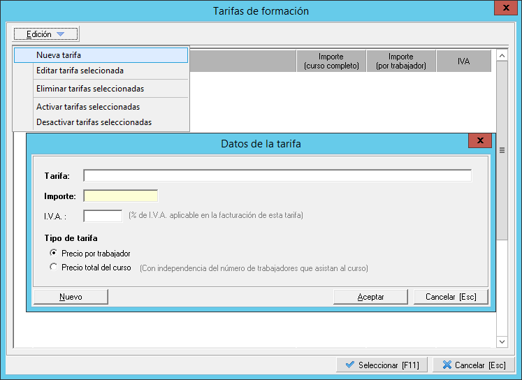 El 'tipo de tarifa' es muy importante en la definición de la misma, ya que al facturar, el precio indicado en la tarifa se aplicará por trabajador que asiste al curso, o por el curso completo independientemente del número de asistentes.
