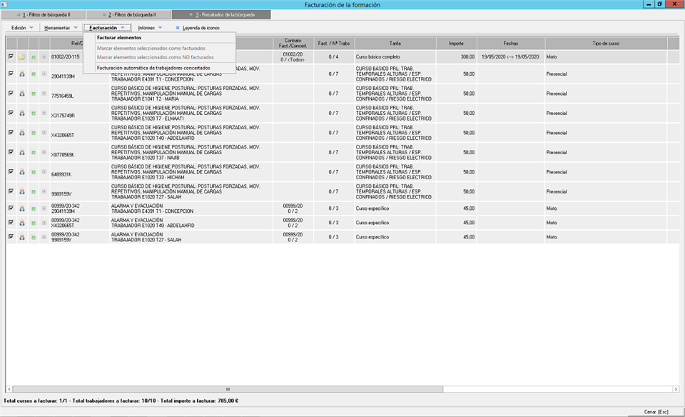 Además, si el curso tiene asignada una tarifa por el curso completo, se habilitará para facturar el registro correspondiente al curso de formación, mientras que si la tarifa asociada al curso es por trabajador, en el resultado de la consulta aparecerán los registros de los trabajadores incluidos en el curso, para poder facturar a cada trabajador que asiste al mismo.
