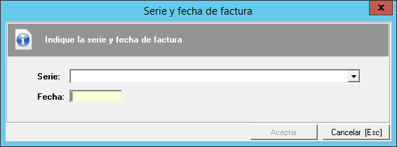 Una vez que pulsa esta opción, aparecerá un pequeño formulario, en el que tendrá que indicar la fecha y serie de las facturas a generar.
