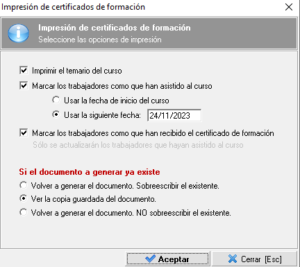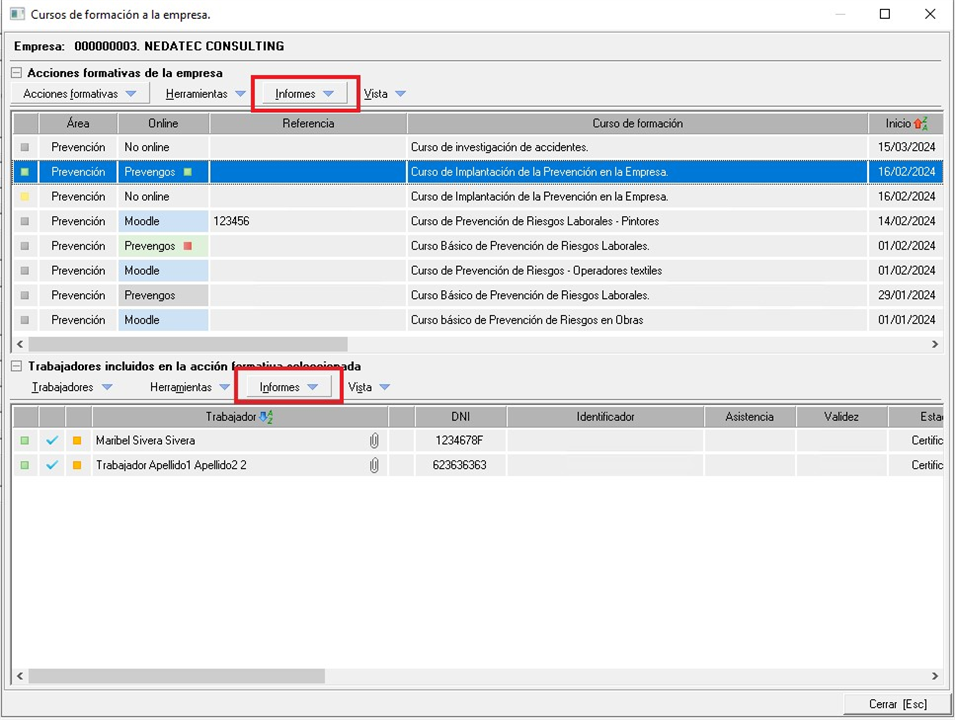 Se accede a la impresión de los informes de certificado de asistencia, certificado de formación al trabajador e informe de cumplimentaciones desde la web. Mediante la generación de los dos primeros informes se puede gestionar el progreso del trabajador en el curso (fecha de asistencia y marca de certificado de formación entregado). Se van a exponer todos detalladamente a continuación: