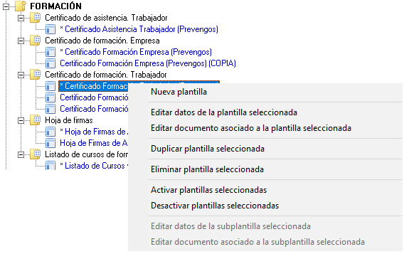 Aunque de manera general se recomienda tener una o pocas plantillas para un mismo informe, en ocasiones se necesita más una plantilla para los certificados de formación al trabajador. Por ejemplo, puede existir la necesidad de tener una plantilla específica para los certificados de formación del área de la construción de manera que se especifique el número de registro de la Fundación Laboral de la Construcción.