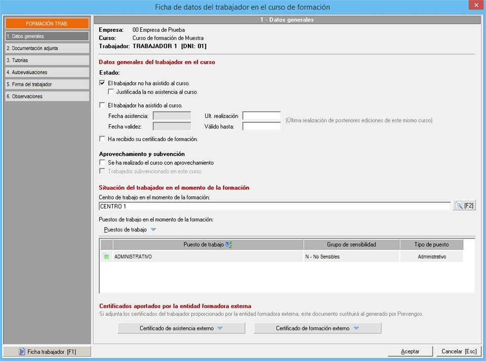 Sobre la situación del trabajador, podemos indicar el centro de trabajo en el momento de la formación así como el puesto de trabajo. Este último podremos asignarlo desde el mantenimiento, el indicado en la ficha del trabajador (puesto administrativo) o los indicados en la evaluación de riesgos (puestos preventivos)