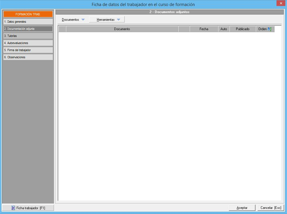 En esta ventana podemos gestionar los documentos adjuntos a la ficha del trabajador en el curso de formación, siendo similar a la siguiente imagen: