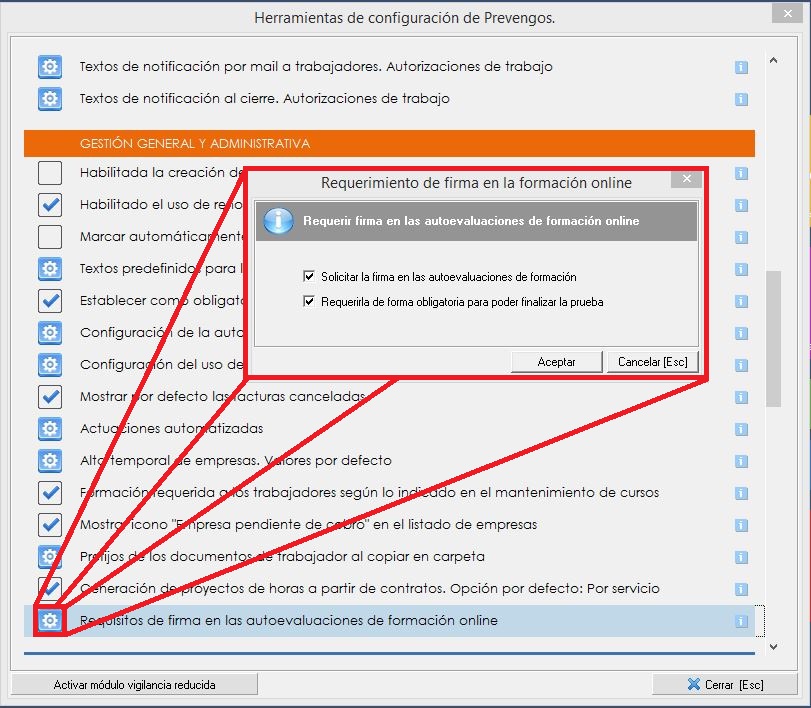 Prevengos dispone de una configuración para poder requerir que el trabajador firme tras realizar la autoevaluación, y que este requerimiento sea obligatorio para poder terminar la prueba. Para realizar esta configuración, accederemos a la pantalla principal del programa, menú superior Configuración y seleccionamos Configuración de Prevengos. En la ventana que se muestra, dentro del área de gestión general y administrativa buscamos Requisitos de firma en las autoevaluaciones de formación online, tal y como vemos en la siguiente imagen: