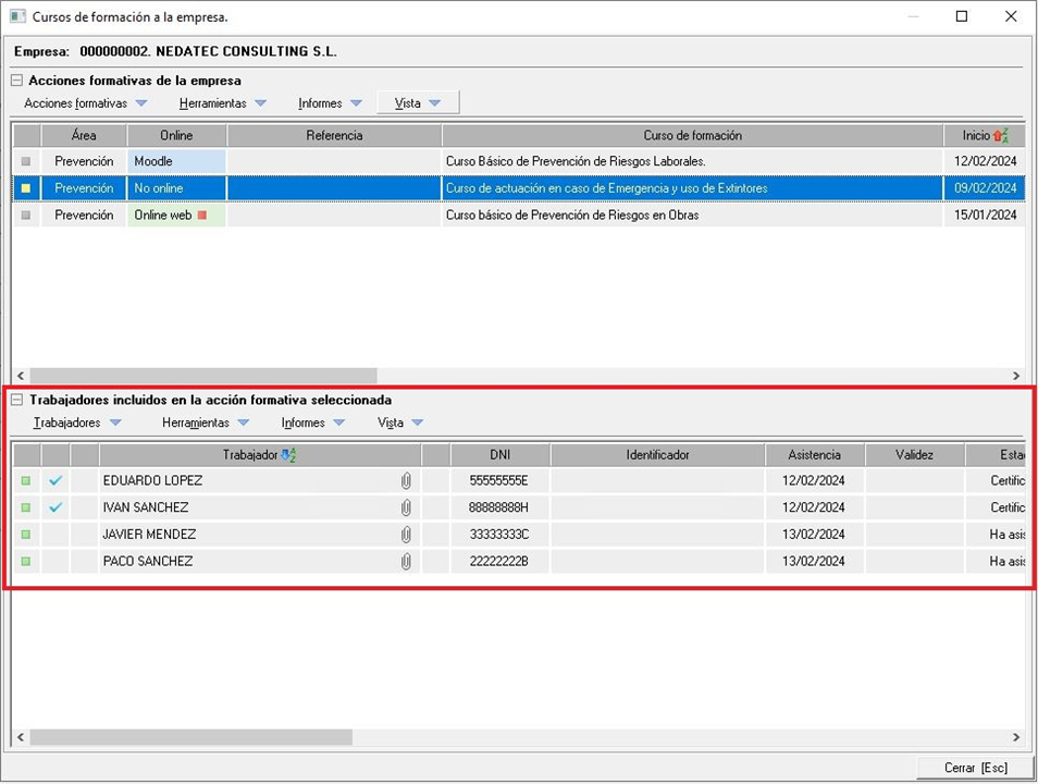 Una vez seleccionamos un curso de formación de la empresa, nos aparecerán en la parte inferior aquellos trabajadores incluidos en el mismo. En este manual vamos a ver todas las herramientas disponibles para la gestión de los trabajadores incluidos en una acción formativa.