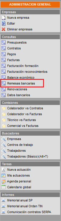 Para generar una remesa bancaria y el fichero necesario para su envío a la entidad bancaria seleccionada, entre en el módulo de Administración->Consultas-> Remesas bancarias.