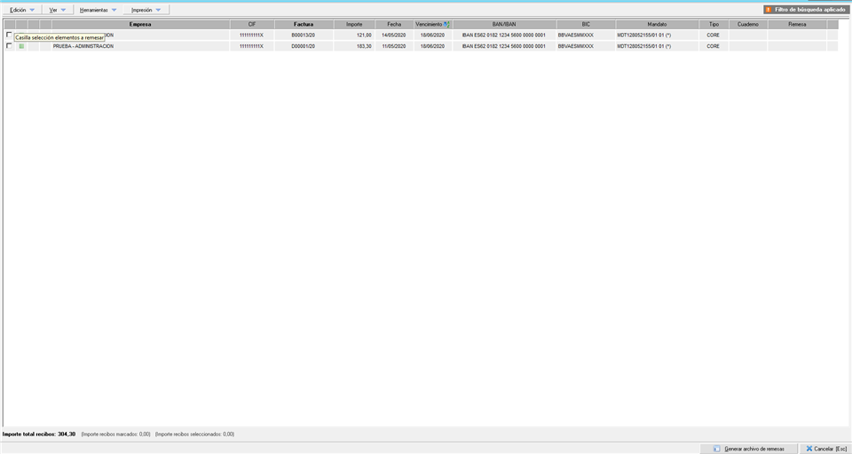 Se abre una pantalla con todos los recibos que hemos generado hasta la fecha y que no han sido ya remesados.