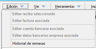 Edición->Historial de remesas. En caso de requerir realizar alguna acción sobre una remesa ya generada, puede acotar la búsqueda de remesas introduciendo los filtros necesarios.
