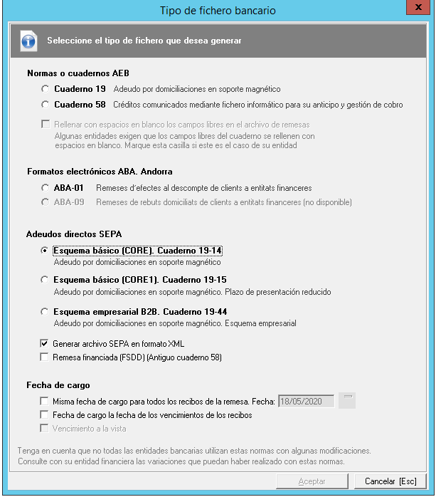Fecha de cargo: Tenga en cuenta que si marca la opción "Fecha de cargo la fecha de los vencimientos de los recibos" su entidad bancaria abonará en su cuenta los recibos de forma individual, no por el total de la remesa.