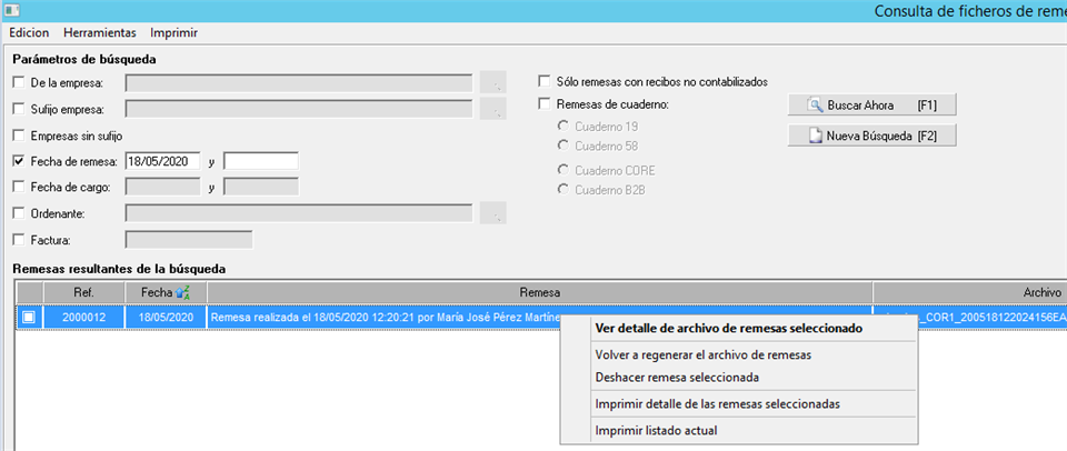 Una vez acotada la búsqueda, seleccione la remesa y con el botón derecho del ratón se abre una ventana con las distintas opciones.