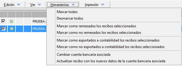 Desde el menú 'Herramientas' dispone de opciones para realizar acciones masivas sobre los recibos.