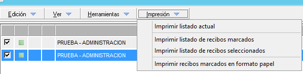 Desde el menú 'Impresión' dispone de diferentes tipos de informes para imprimir el listado de recibos que tiene en pantalla.