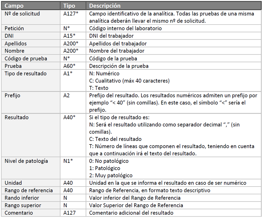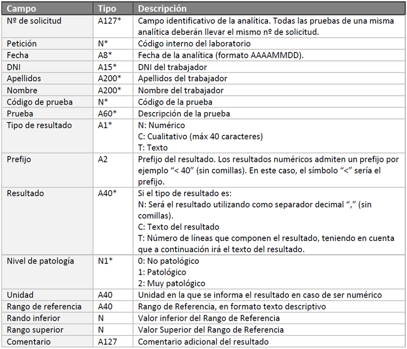 - Los campos obligatorios, *, deben aparecer en cada línea del fichero.