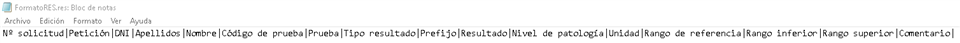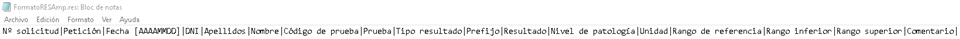 RefExterna01|7738|12345678A|1erApellido 2oApellido|Nombre|40|HEMATIES/HEMOGLOBINA|C||POS||||||COMENTARIO|