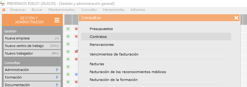 La consulta de contratos es un buscador que utilizarán los usuarios cuando necesiten localizar contratos fijando unos parámetros específicos de búsqueda. En dicho buscador Prevengos ofrece la posibilidad de utilizar filtros por datos relacionados con el contrato, como pueden ser, datos de las empresas sobre las que se crean dichos contratos y filtros de datos particulares de los propios contratos, como pueden ser fechas, importes, estados de los contratos, servicios contratados, etc.